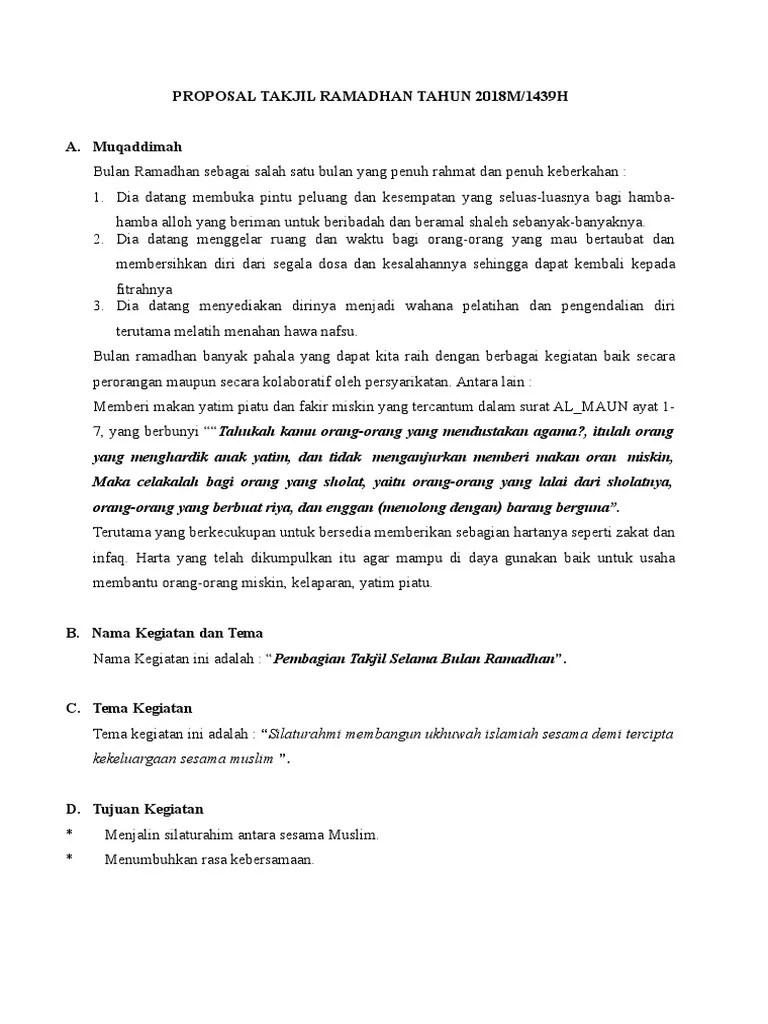 Dana untuk terwujudnya pembagian takjil di bulan ramadhan ini. Contoh proposal proposal sangat berguna dalam pembuatan kegiatan karna proposal dapat membantu kita dalam pencaharian dana dalam kegiatan yang . "dana yang kita gunakan kegiatan ini cukup lumayan banyak. Sumber dana proposal kegiatan bulan ramadhan. Dana operasional masjid fauzul adzim jl.